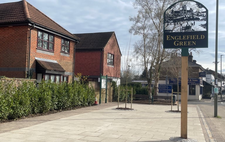 The area on the North side of St Jude's Road, opposite Stopps and between Alexandra Road and Victoria St had long been in need of a tidy up and made in to an area that's more use as a Village centre. To be able to go ahead with the refurbishment work, we secured grants from Surrey County Council (thanks to County Councillor Marisa Heath and others) and from Runnymede Borough Council (thanks to Borough Councillors Berardi and Gates).