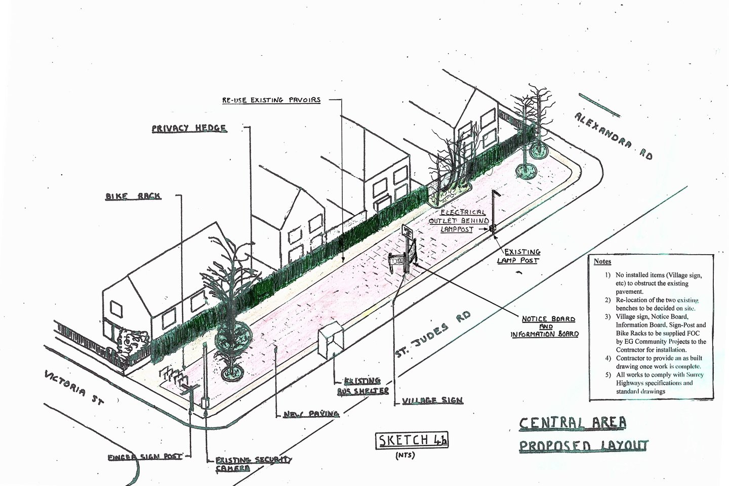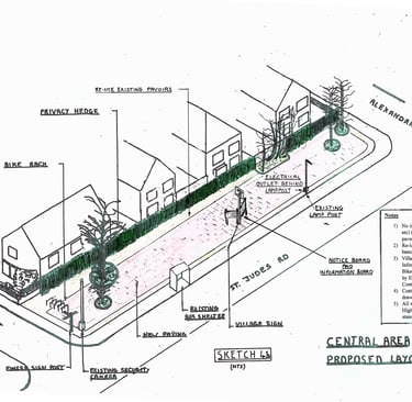 Most villages and towns in this country have a town square or similar central area around which the community sits and events take place. Our Village Green is some distance away from the shops and public transport access and so this project (which was proposed in the Neighbourhood Plan) entails refurbishing the area on the North side of St Jude's Road in between Victoria St and Alexandra Road to create just such a space. The trees and hedges have become very overgrown, blocking light from the homes behind and the space will be redesigned to allow for a safer and more suitable environment and will generally create a more useable area in the centre of our Village